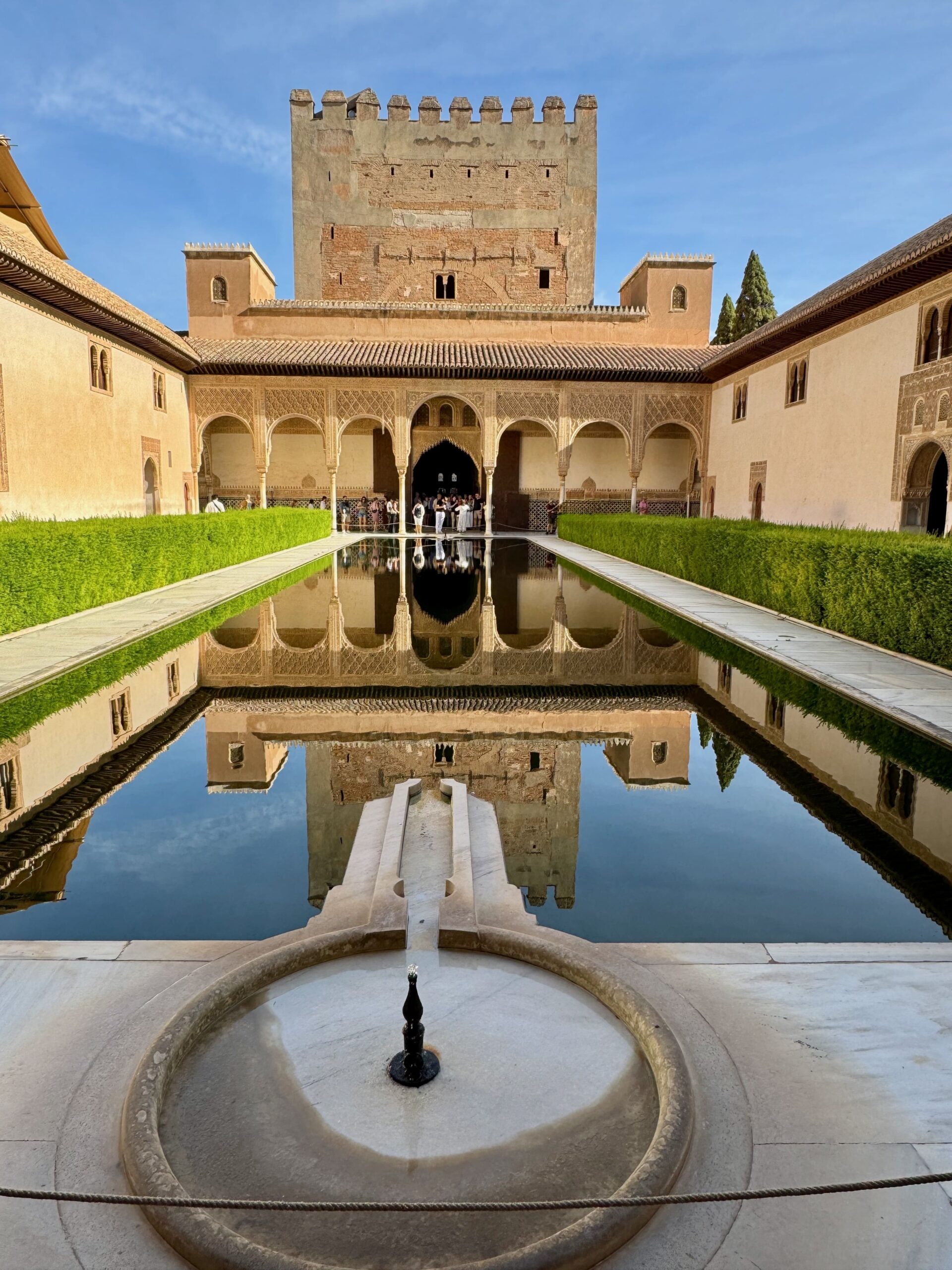 A ramp down to the palaces, where the first to visit was the Comares Palace. Entering, we were instantly faced with the beautiful Patio de los Arraynes (Court of the Myrtles in English), named for the eponymous bushes that line the edge of the rectangular pool. The courtyard is one of the most iconic images of the Alhambra and rightly so. It is utterly stunning, often described as a masterpiece of Islamic architecture. Every feature has purpose. From the rooms flowing off on all sides, to the mirror like pool perfectly reflecting the beautiful architecture surrounding it. Despite there being many people, the space felt tranquil.